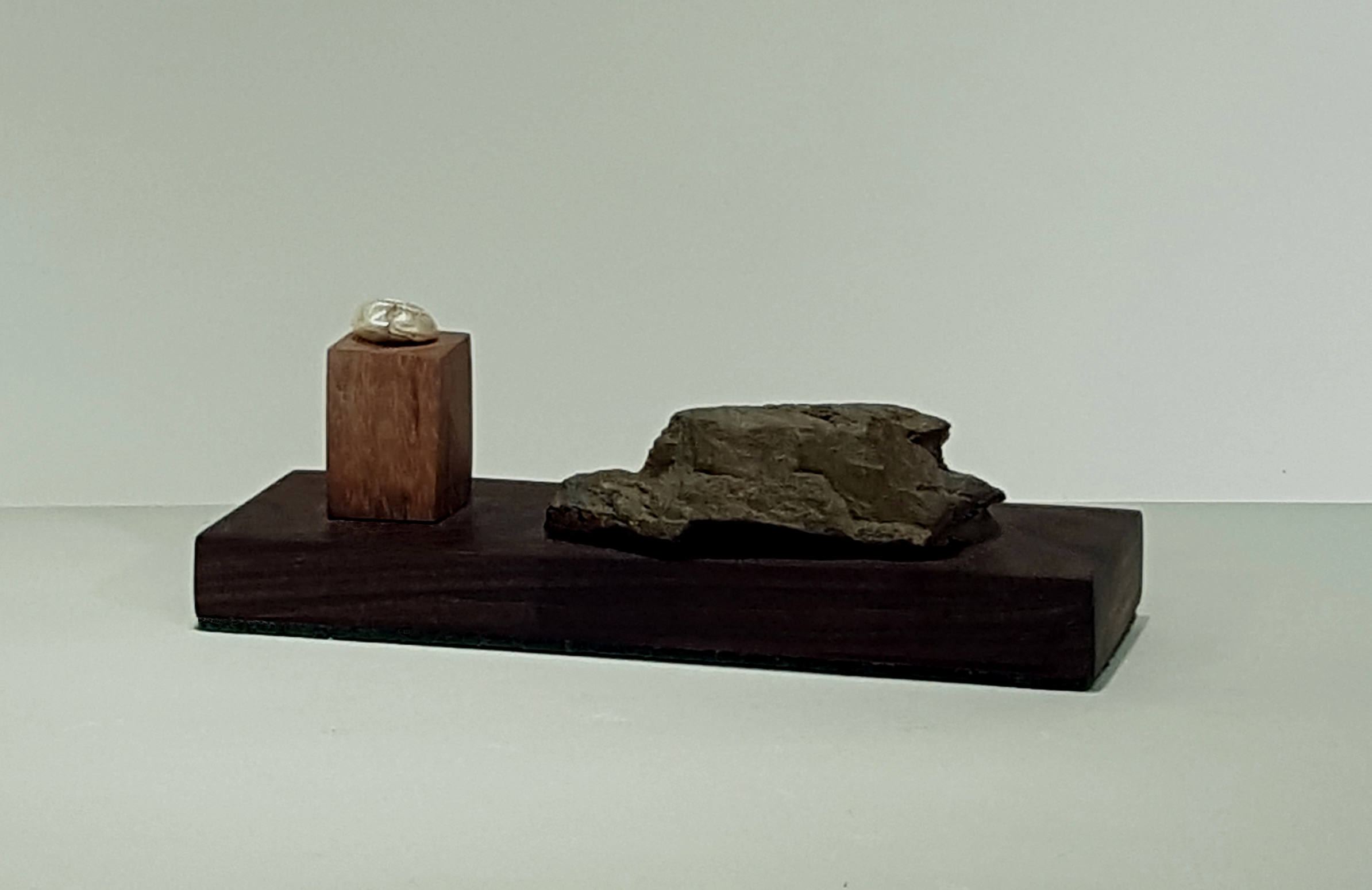 walnut base, found stone, oak column, natural fresh water pearl