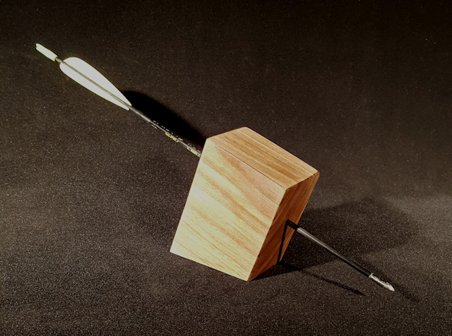 "Refraction" is a conceptual work dealing with the nature of reality. The piece comprises an arrow ostensibly shot through a solid block of wood. Upon examination the fletched and pointed segments of the arrow are parallel but displaced vertically in the wood block; much like an object's image is refracted in water. The piece conflates the perception of what we are actually seeing with what is physically realizable.This work has conceptual roots in surrealism.