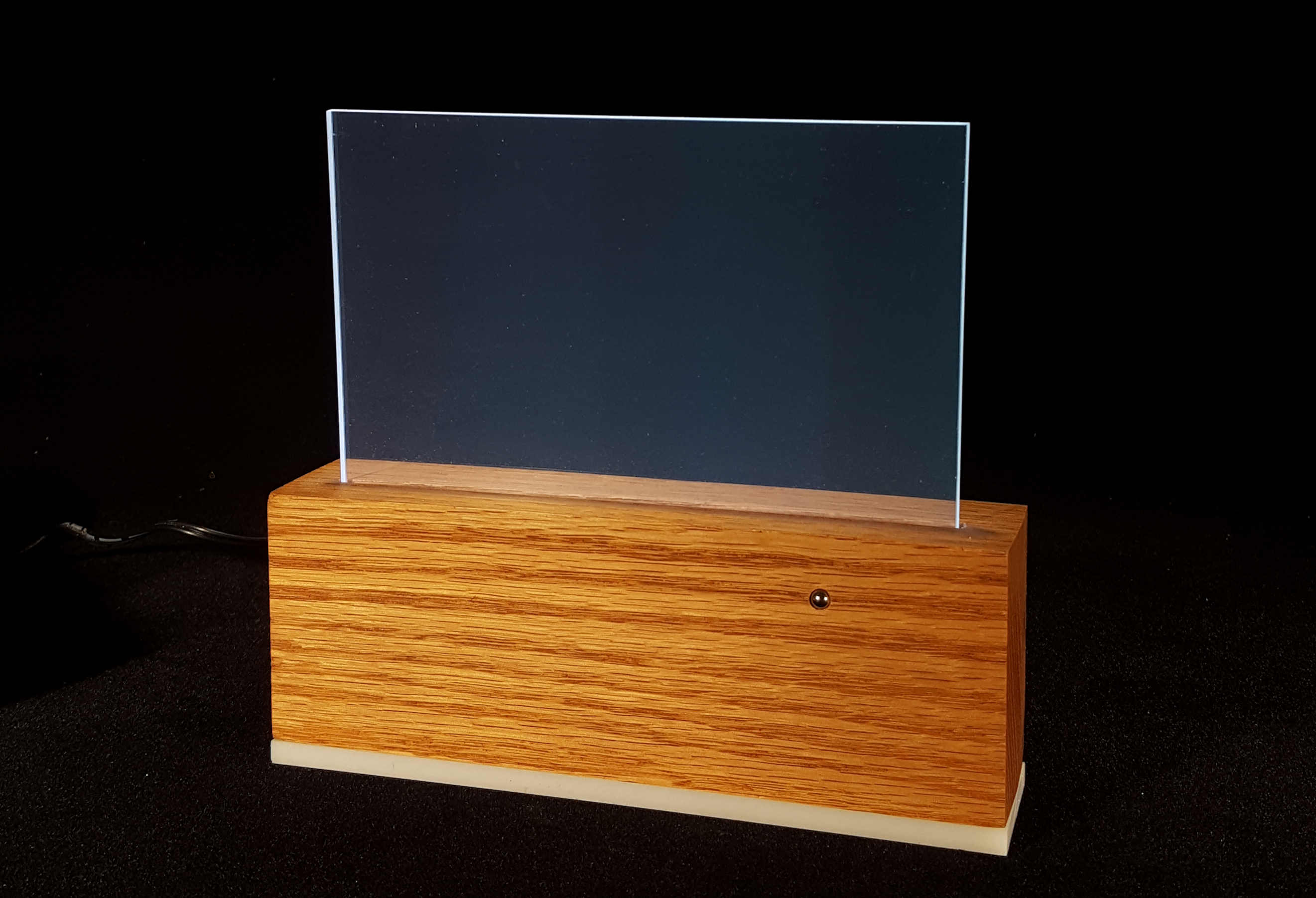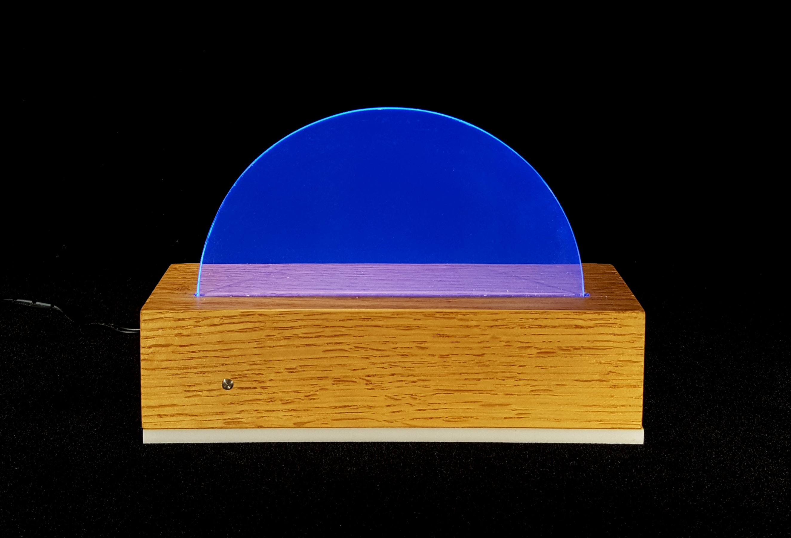 A translucent cylinder is suspended above a wooden base supported by a transparent acrylic plate. The plate acts as a light pipe thereby illuminating the suspended cylinder with selectable dynamically changing color palettes.