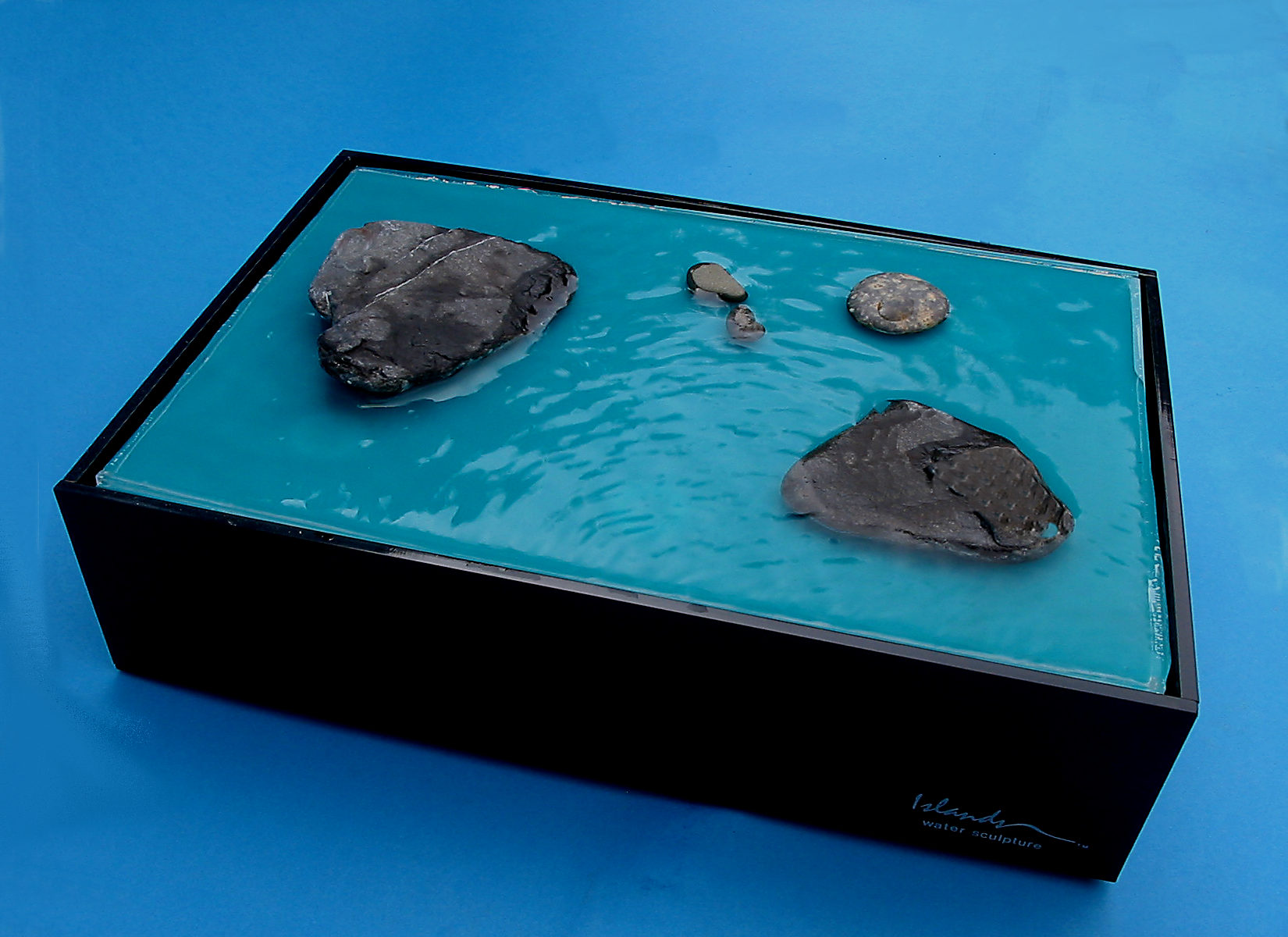 Having roots in symbolic naturalism, this fountain was originally conceived as a dynamic water analog to a formal Japanese Zen garden. A submerged pump outputs water below one of the rocks forming patterns on the surface of the platform that move among the rock elements evoking the feeling of ocean waves surrounding islands.
