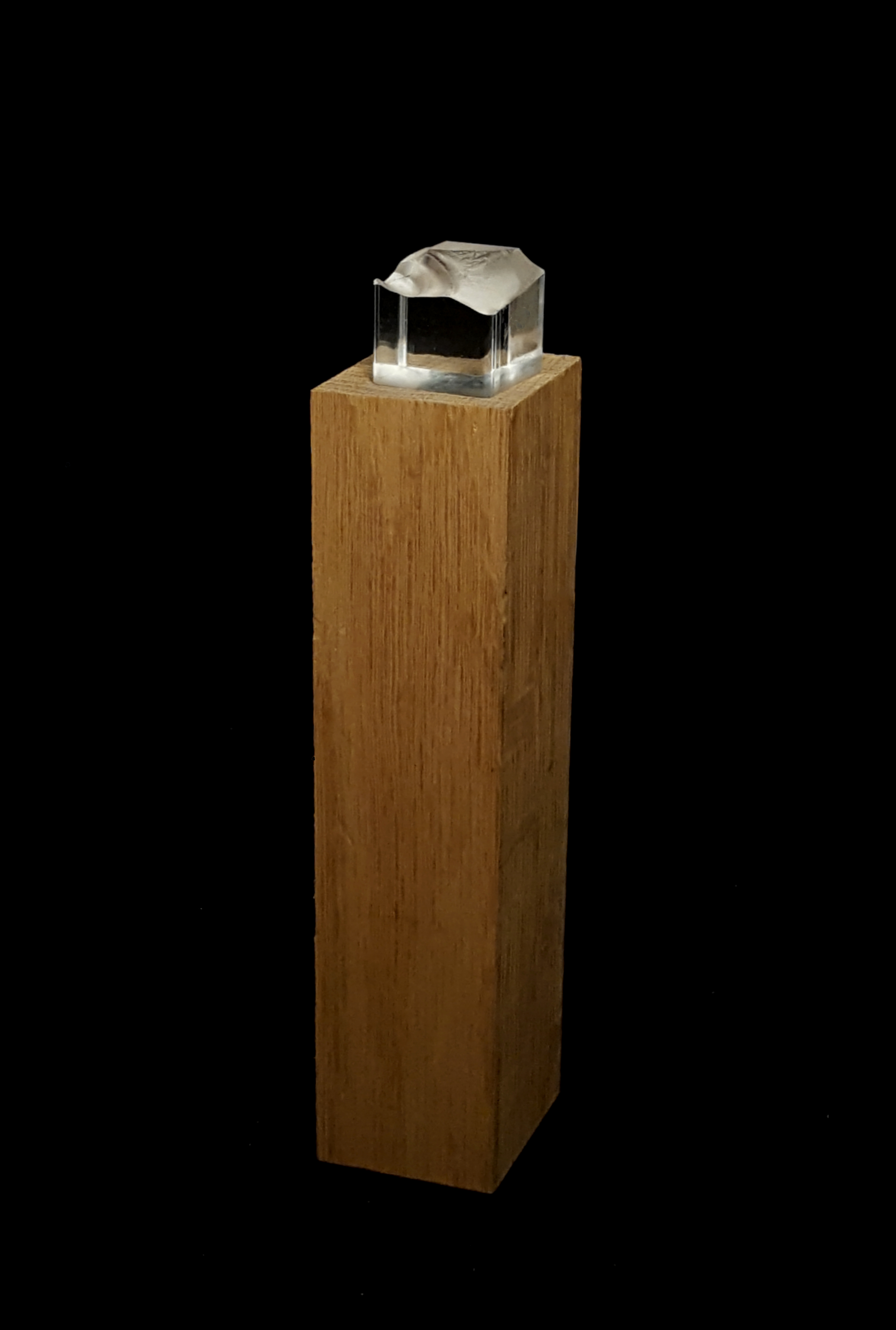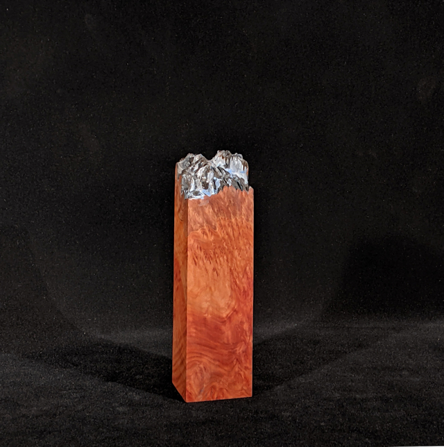 In this piece the surface of the acrylic sculpture is meant to evoke a snow-covered mountain topography. Conceptually, the piece was inspired by Japanese Suiseki.