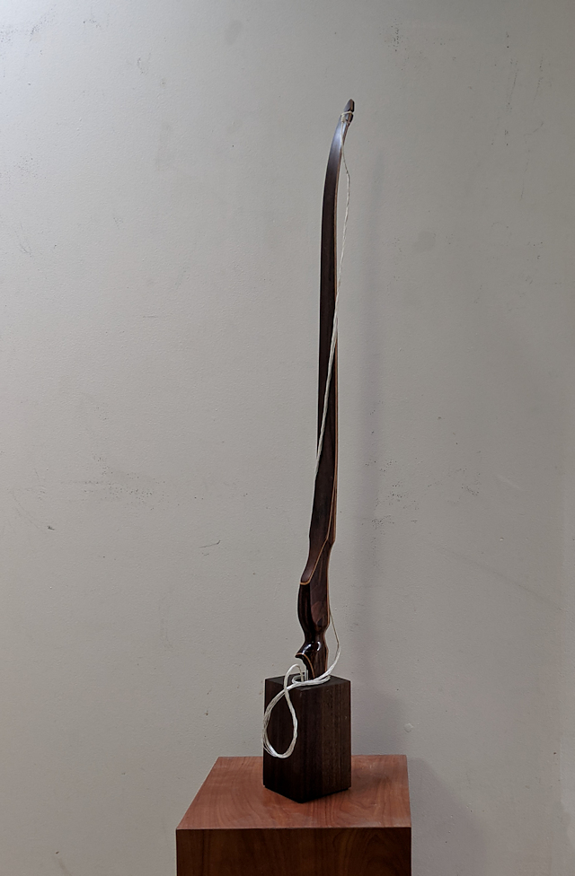 This is a non-functional bow fragment and unwound string. In "Redux" the bow fragment is given a new life. Since  a broken bow implies a potential tragedy to an archer, the meaning to an archer is potentially foreboding. To others the work is meant to appear enigmatic. This work has conceptual roots in surrealism.