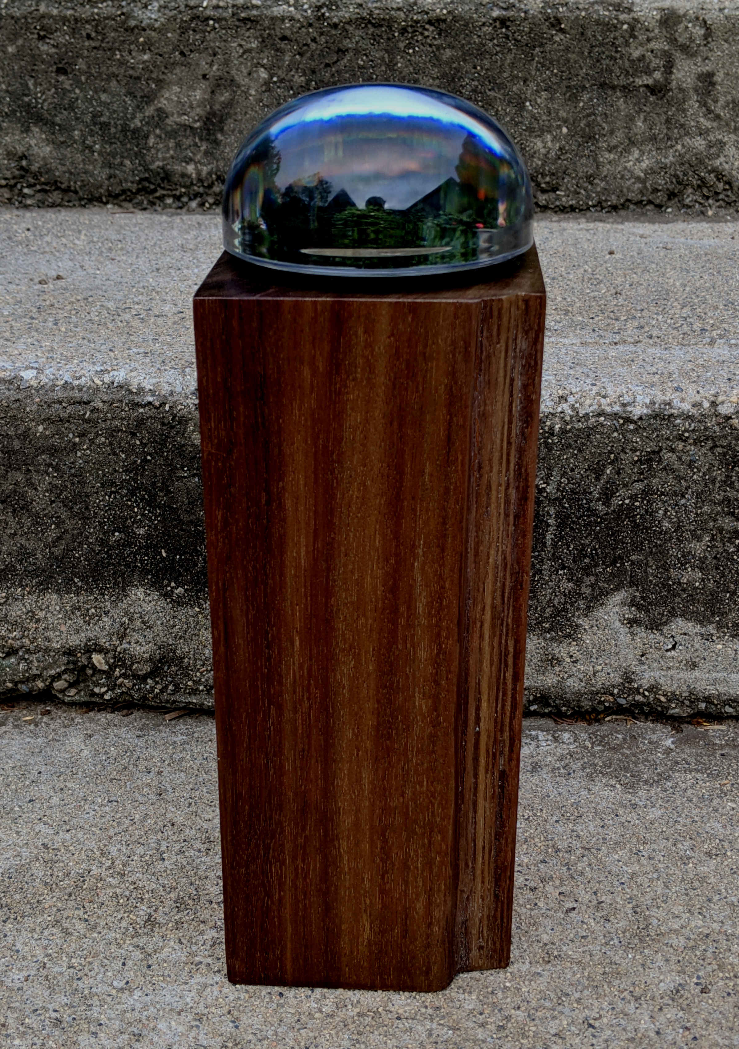 "Thin Place" is a conceptual metaphor for thin places in Celtic Christian mythology. The earth is represented by a distressed solid walnut column - an evocation of wabi-sabi. The sky is represented by a solid glass hemispherical dome having a photograph of clouds at its base. Viewed from above the clouds appear three dimensional as if one were looking at the earth from above. When viewed in nature from the side, the dome reflects a microcosm of earth and sky thus reinforcing the metaphor.