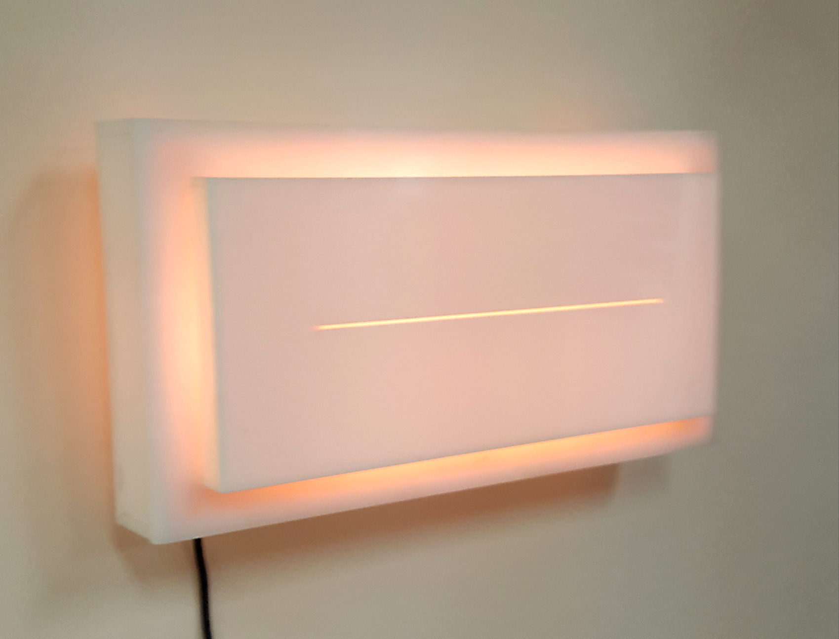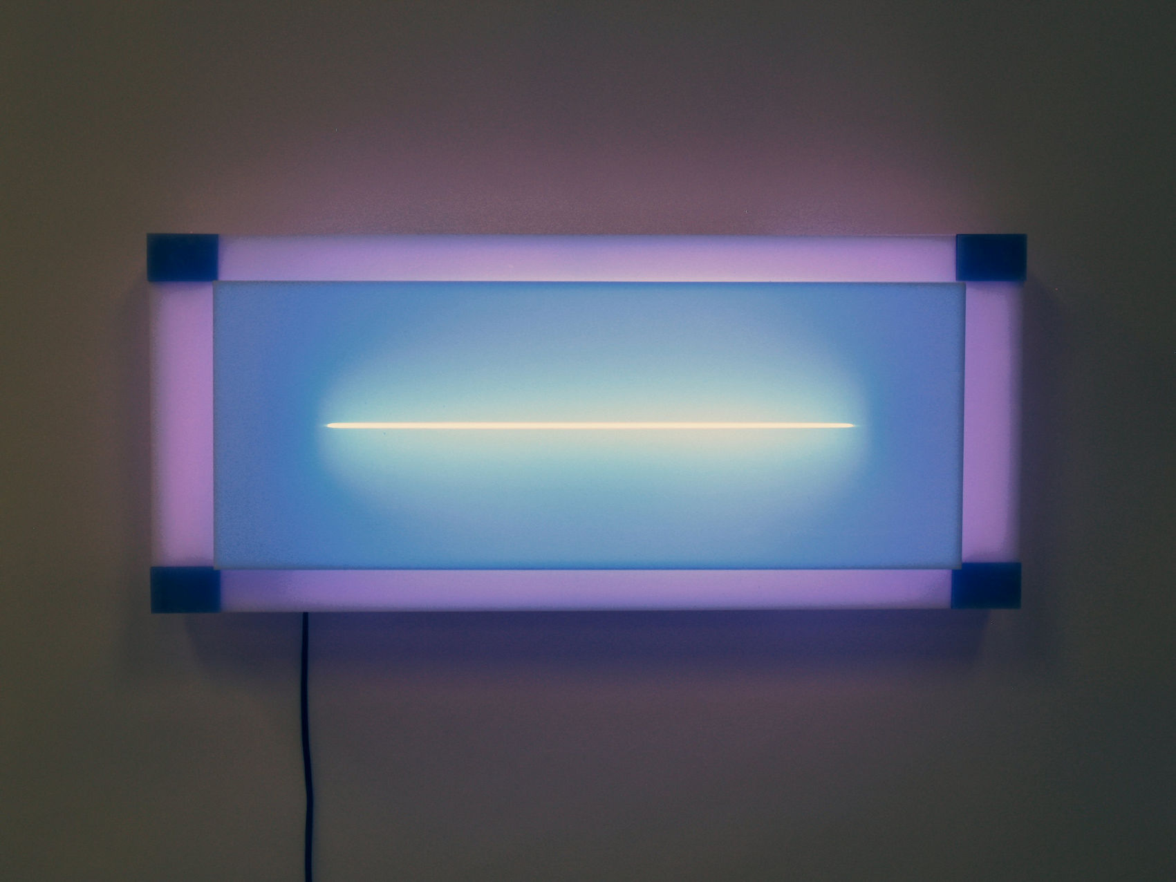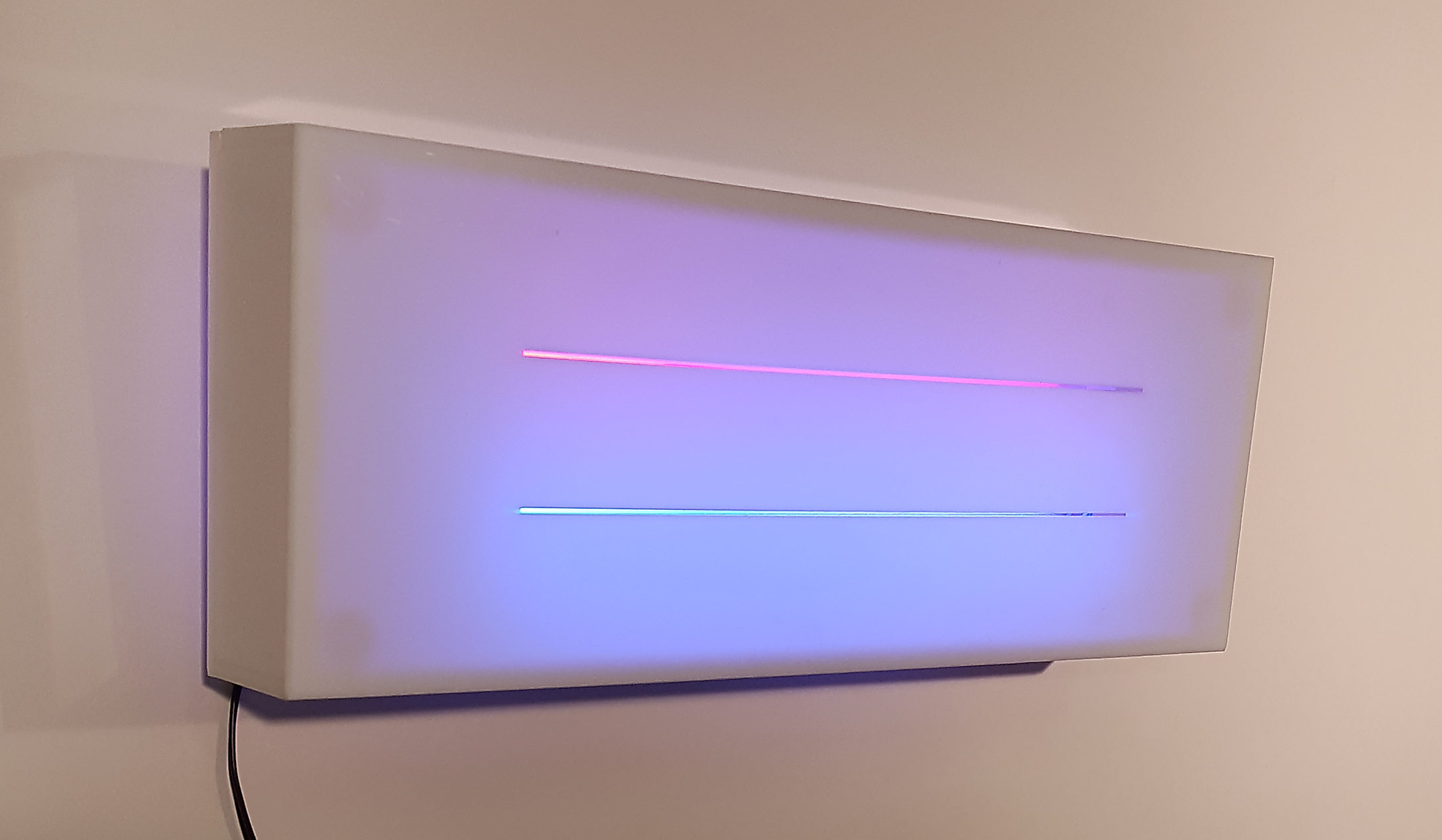 The color of a central linear light pipe morphs in opposition to the diffuse color generated on the translucent surface of the acrylic enclosure. There are five color modes that can be addressed to change the part of the visible spectrum treated. The viewer experiences ever-changing subtle color contrasts between the light pipe and the background which slowly morph over time and never repeat.