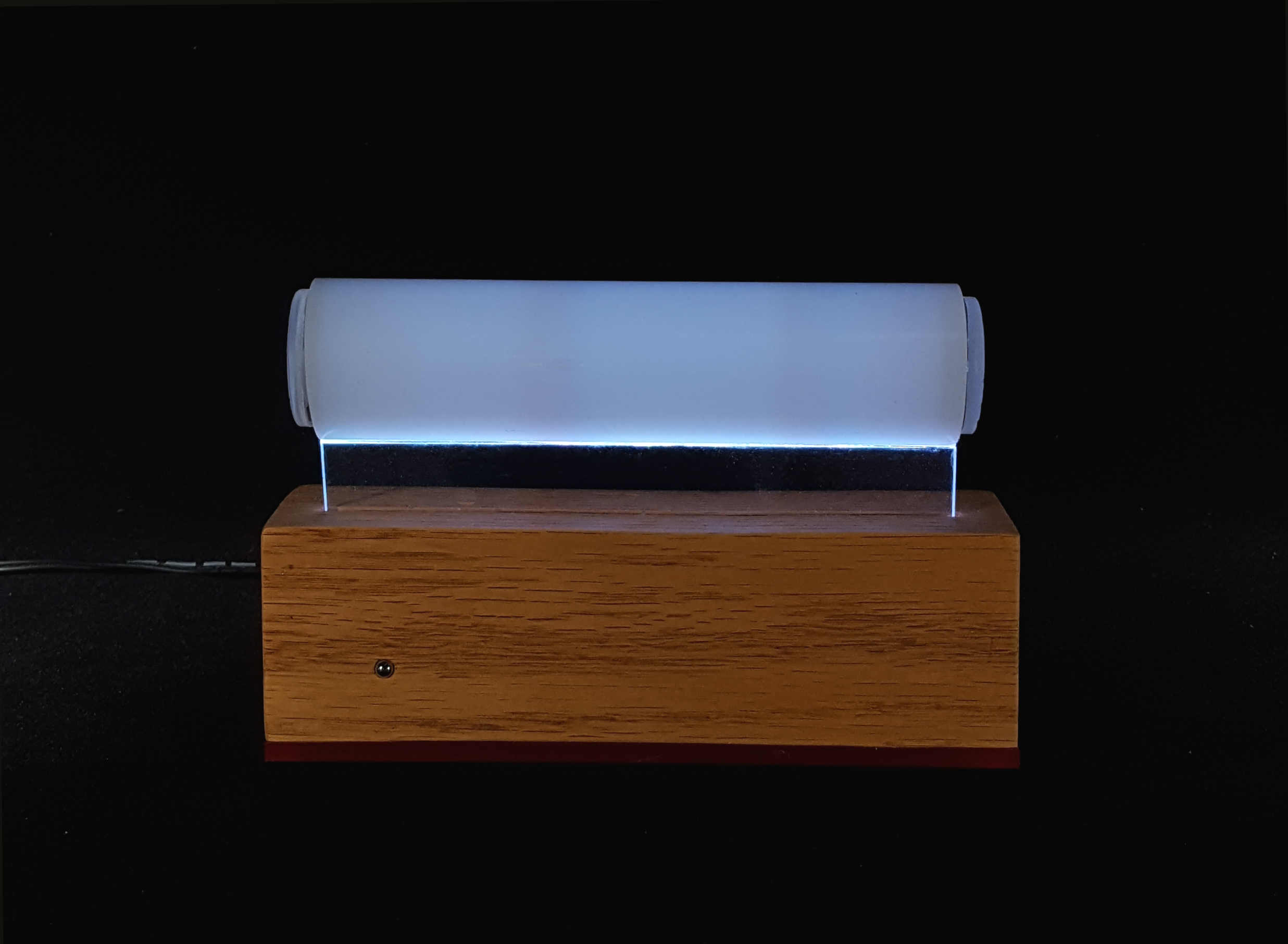 A translucent cylinder is suspended above a wooden base supported by a transparent acrylic plate. The plate acts as a light pipe thereby illuminating the suspended cylinder with selectable dynamically changing color palettes.
