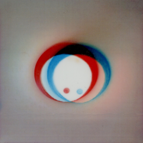 When viewed with anaglyph glasses (red/blue), the red and blue curves coalesce into a single black curve which floats around a central white orb, symbolizing the merging of ying and yang.